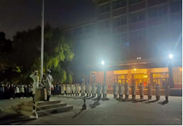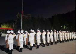 6时45分,国旗仪仗队迈着整齐有力的步伐护送国旗走向旗杆,全体师生庄严肃立,面向国旗,共唱国歌,注视着五星红旗在雄壮的国歌声中冉冉升起。