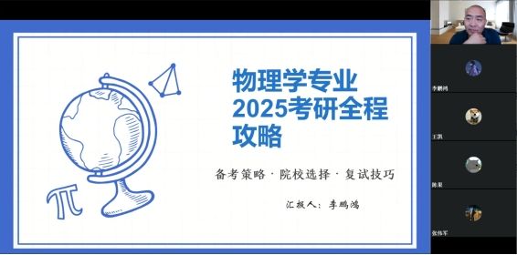 为进一步营造浓厚的考研氛围,提高员工考研热情,物理学专业于6月10日晚上举办了考研经验分享交流活动,本次活动采取线上形式。参加本次会议的有物理学教研室部分教师、2025届毕业员工及2022级和2023级拟考研员工共40余名。