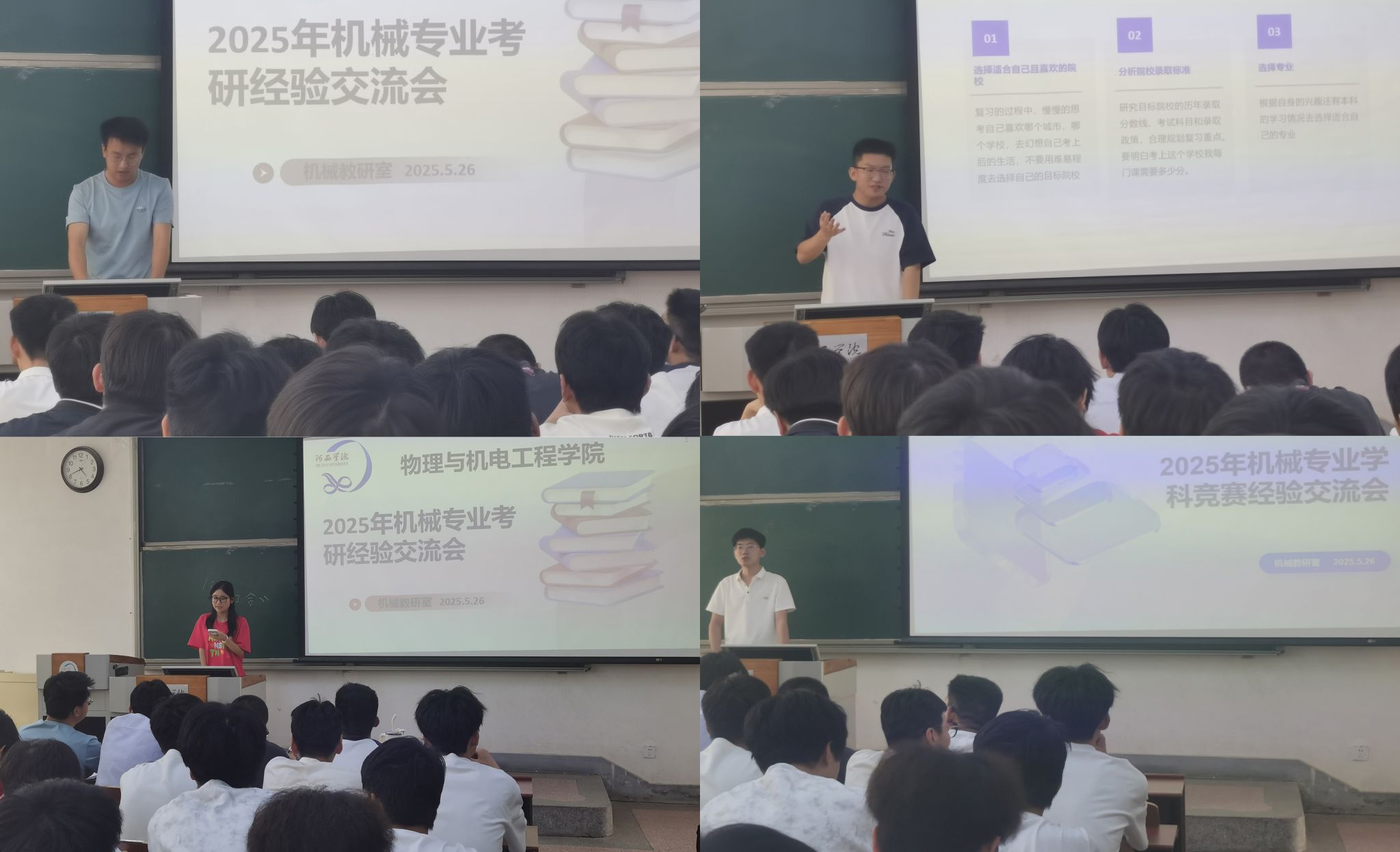 2025年5月26日下午,世界杯8833300足球机械设计制造及其自动化专业成功举办"研途有光·赛出精彩"主题经验分享交流会。本次活动旨在通过优秀学子现身说法,帮助260余名机械专业员工明确发展方向,激发学习内驱力。