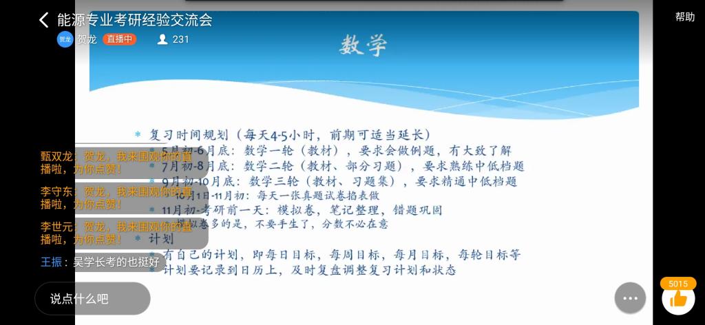 能源2016级的两名考研代表夏忠虎与杨乐杰同学,向低年级的同学从我的大学学习、我想考研、我要考研、我在复习考研中的成长、我爱新能源等多个方面,分享了自己在大学学习中积极调整学习方法适应本科教育、不断制定专业学习目标分层分阶段实现、努力学习不断强化自己的专业信念等方面的成长经历,从考研目标的确定、复习中的时间管理、精力分配、资源选择、互相督促、心理的自我调整、自我激励出发,介绍了考研成功的经验,并向低年级的同学送上了考研成功的祝福。